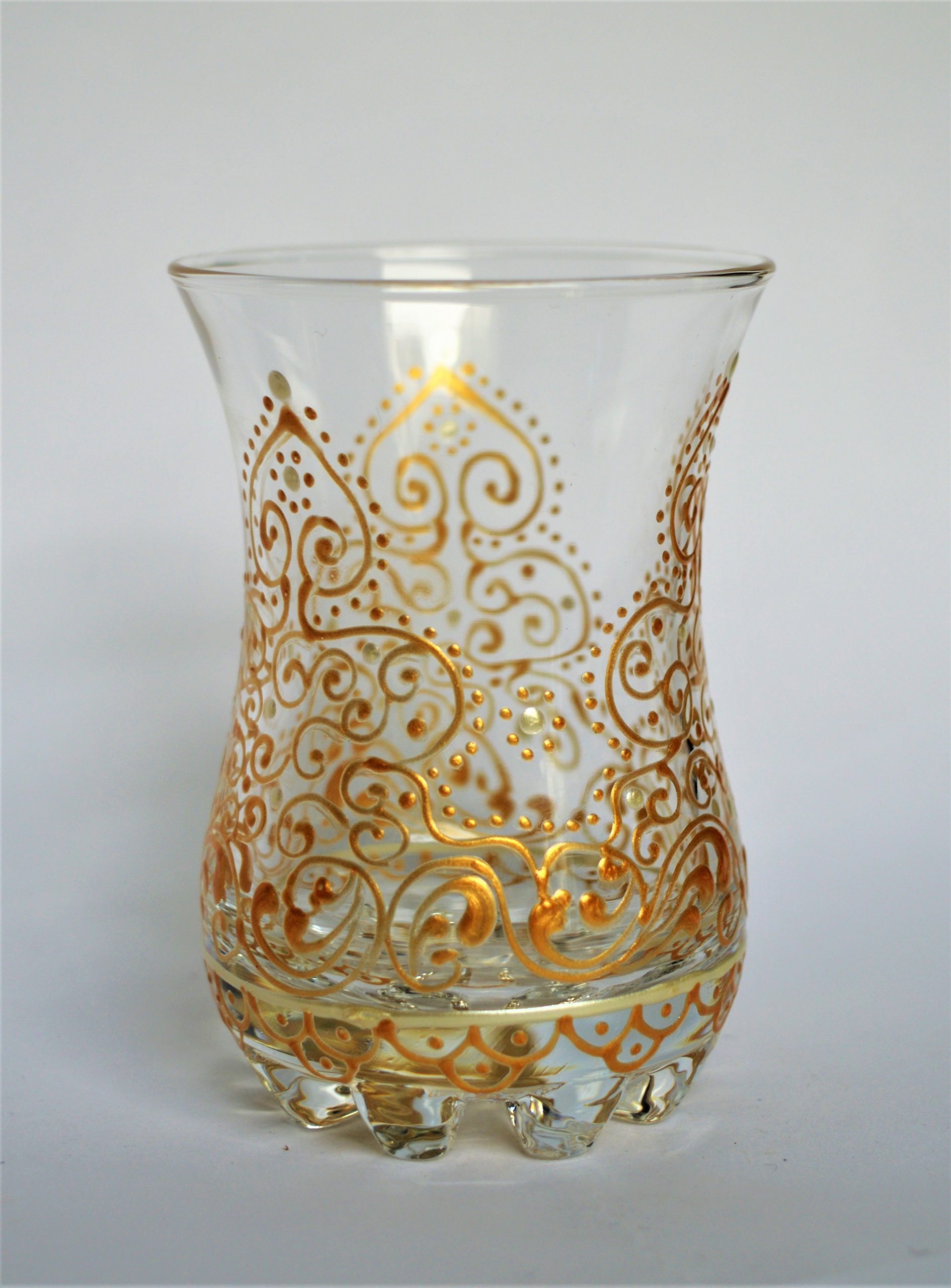 Ce verre à thé délicatement peint et décoré à la main aux motifs orientaux sur un fond transparent peut être utilisé pour servir à vos convives du thé à la menthe …ou une excellente idée cadeau.